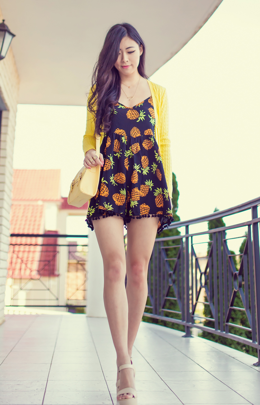 I hope everyone is having a great 4th of July! It's actually the 5th over in Aus but when I opened Instagram this morning my feed was just absolutely flooded with people celebrating in red ,white and blue! Today I'm wearing a new pineapple romper from Shop Fashion Avenue, an Aussie online boutique that ships worldwide! There's nothing like a bright sunny yellow and a tropical fruit print to cheer up a dismal day. I wore a really old ribbed yellow cardigan from Gmarket and a scalloped yellow bag from ASOS, which is always a welcome pop of sunny colour to an outfit.